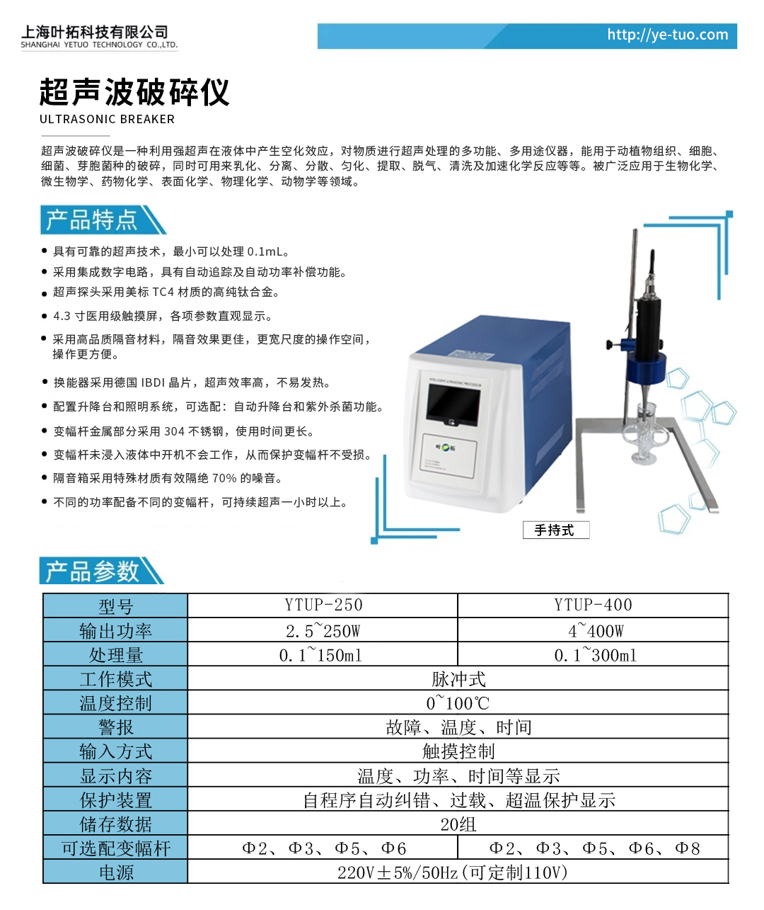 葉拓YTUP系列手持式超聲波細胞破碎儀產(chǎn)品特點: