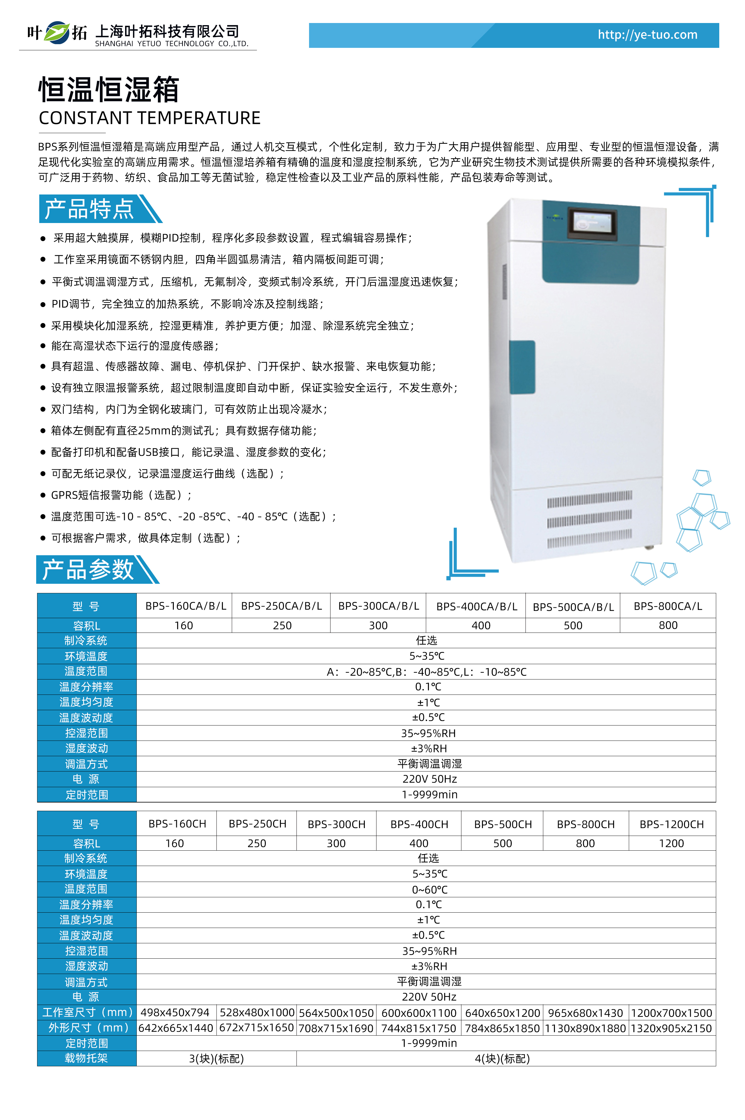 BPS系列恒溫恒濕箱是三發儀器的高端應用型產品,通過人機交互模式,個性化定制,致力于為廣大用戶提供智能型、應用型、專業型的恒溫恒濕設備,滿足現代化實驗室的高端應用需求。恒溫恒濕培養箱有精確的溫度和濕度控制系統,它為產業研究生物技術測試提供所需要的各種環境模擬條件,可廣泛用于藥物、紡織、食品加工等無菌試驗,穩定性檢查以及工業產品的原料性能,產品包裝壽命等測試。葉拓BPS系列專業高端型恒溫恒濕箱產品特點