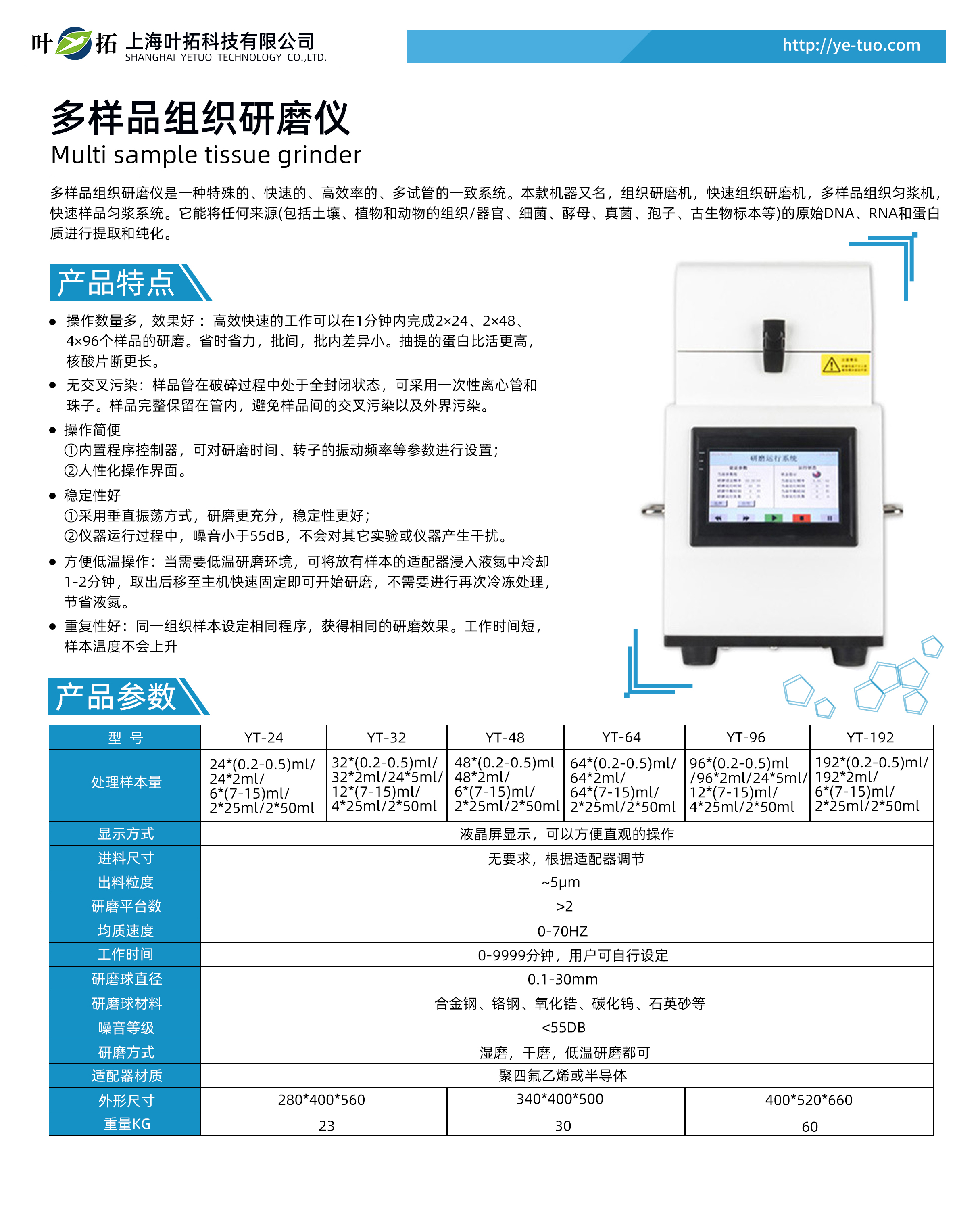 ●操作數量多,效果好:高效快速的工作可以在1分鐘內完成2X24、2X48、4X96個樣品的研磨。省時省力,批間,批內差異小。抽提的蛋白比活更高核酸片斷更長。
